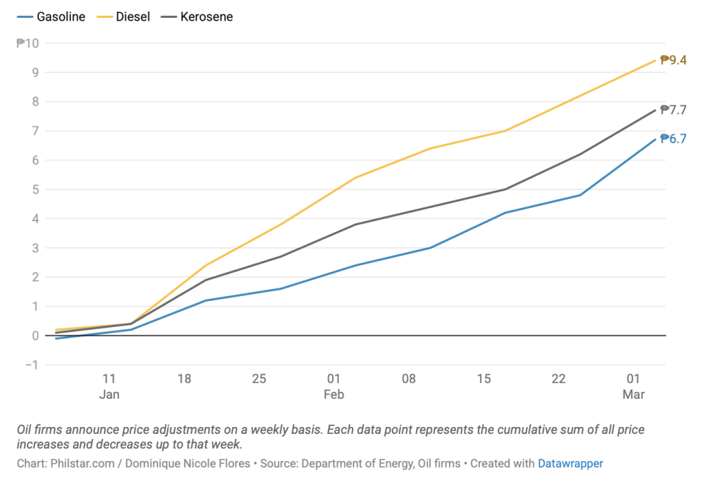 Impact. Last week, fuel prices rose by P1.20 per liter for diesel and kerosene, while P0.60 per liter for gasoline.