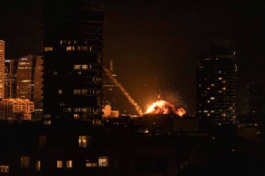 A fireball lights the sky following a missile strike on Tel Aviv on February 28, 2026. AFP / John Wessels